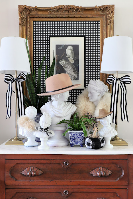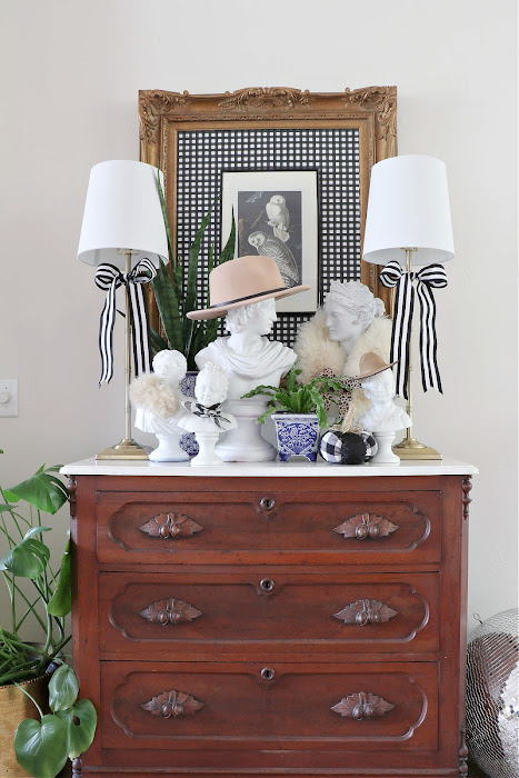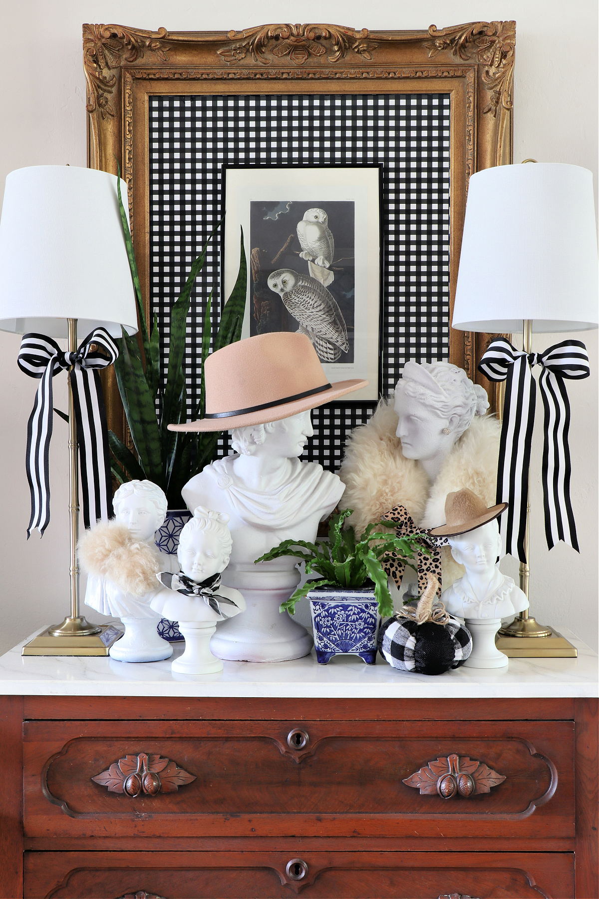 Similar Lamps || Snowy Owls Print || Diana Female Bust || Apollo Male Bust || Boy and Girl Busts || Tan Hat || Fur Collar- thrifted || Small Felt Hat- Walmart Pet Accessories (for Halloween?) || Disco Mirror Ball || Black and White Pumpkin- At Home Stores