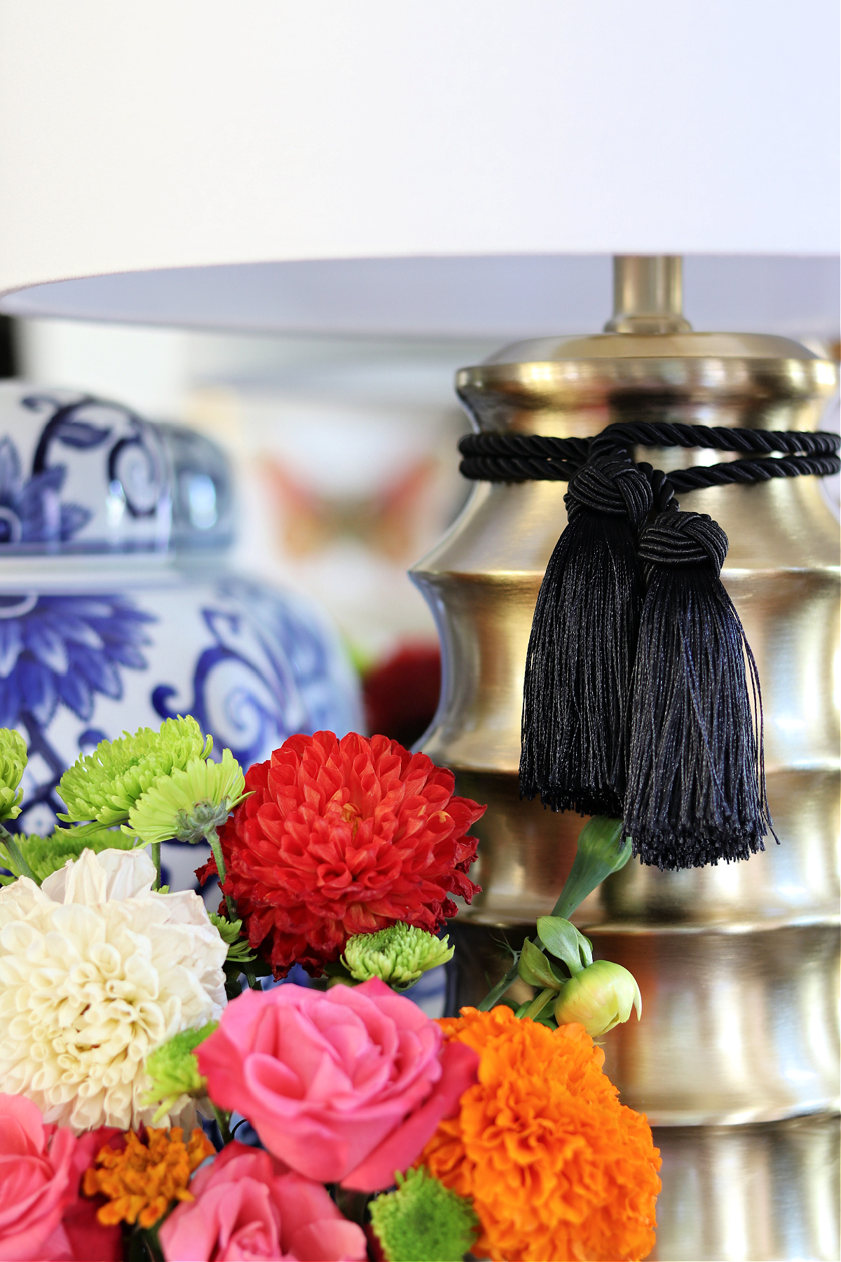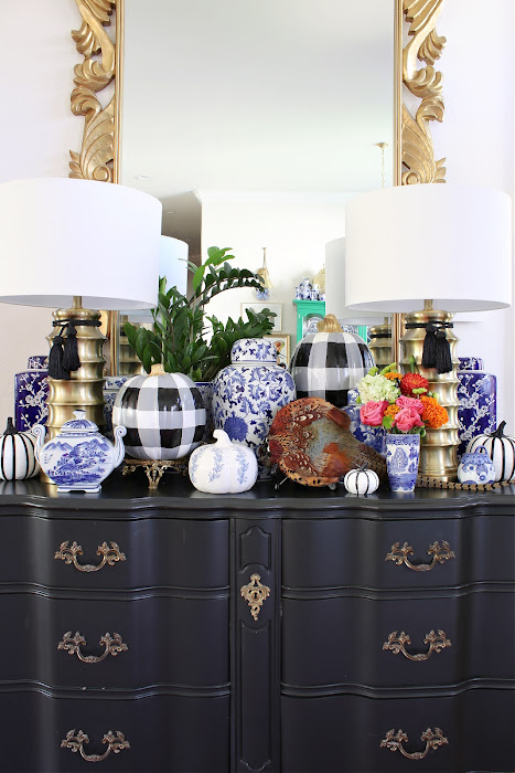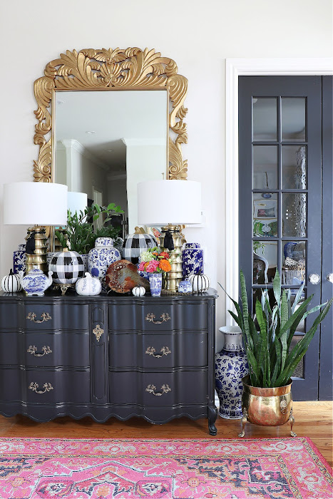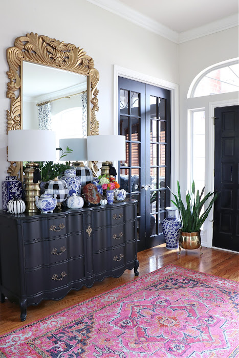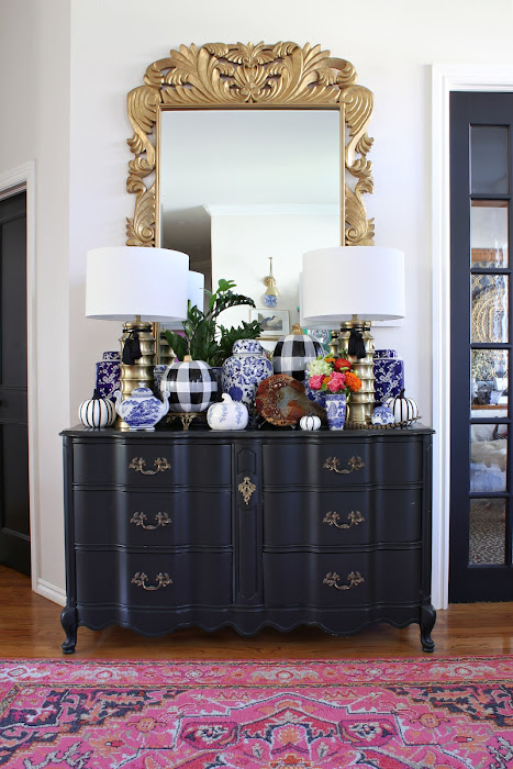 Pink Rug || Lamps || Tassel Ties || Striped and Blue and White Pumpkins- At Home Stores || Dresser- Craigslist, Color- SW Tricorn Black || Mirror- Craigslist, Color- Rustoleum Gold || Gingham Pumpkin Tutorial