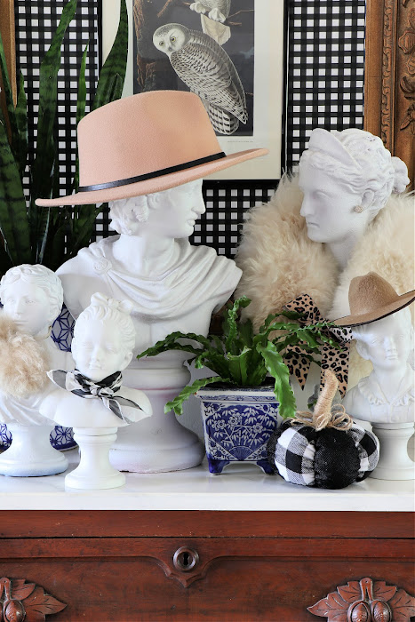 I had fun putting together this vignette using my group of statue busts. It was all inspired by that tiny little cowboy hat that caught my eye in the checkout line at Walmart. There was a kiosk set up with pet costumes for Halloween and I thought the hat might work on my boy- ha! The bigger felt hat is out of my closet, and the fur collar came off of a thrifted coat that I used to recover these stools.