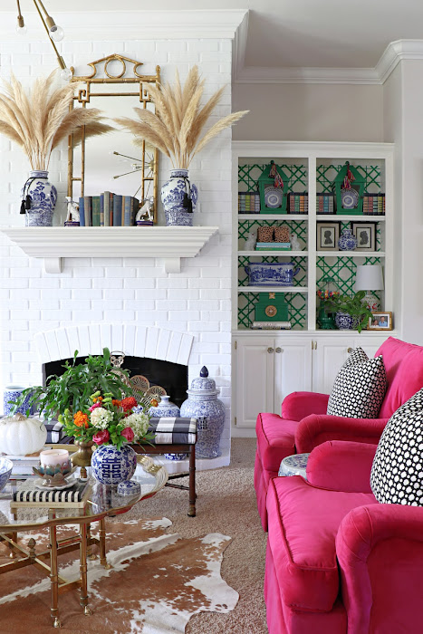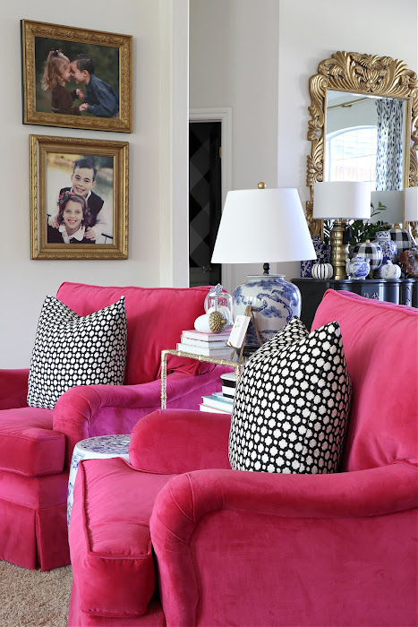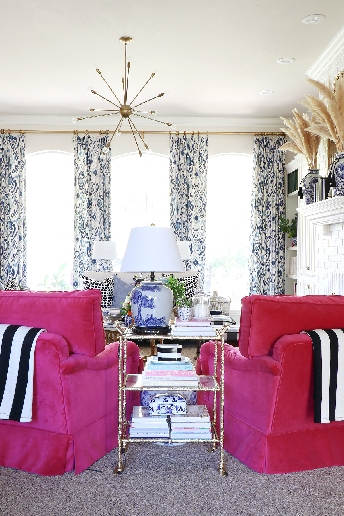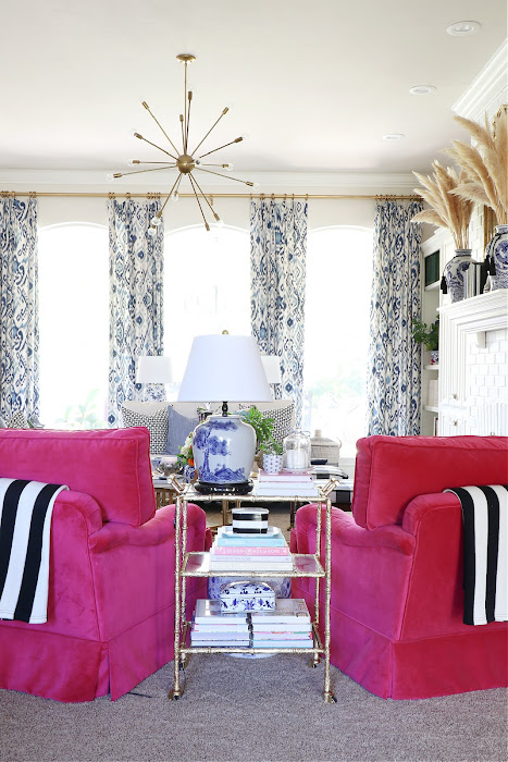 As I mentioned moving things around, the pink club chairs and love seat have traded spots in the Living Room for now. Often when the room is arranged this way I line the chairs up straight side by side like you saw in the photo with the mantel above, but this time I tried angling them together and we're enjoying them turned a bit! It did create a weird open space between the chairs, so this little cart that I've had in storage worked just right. There's a garden stool on the other side of the cart that is nice for setting drinks or whatever on when needed.