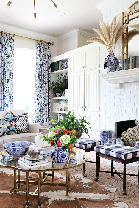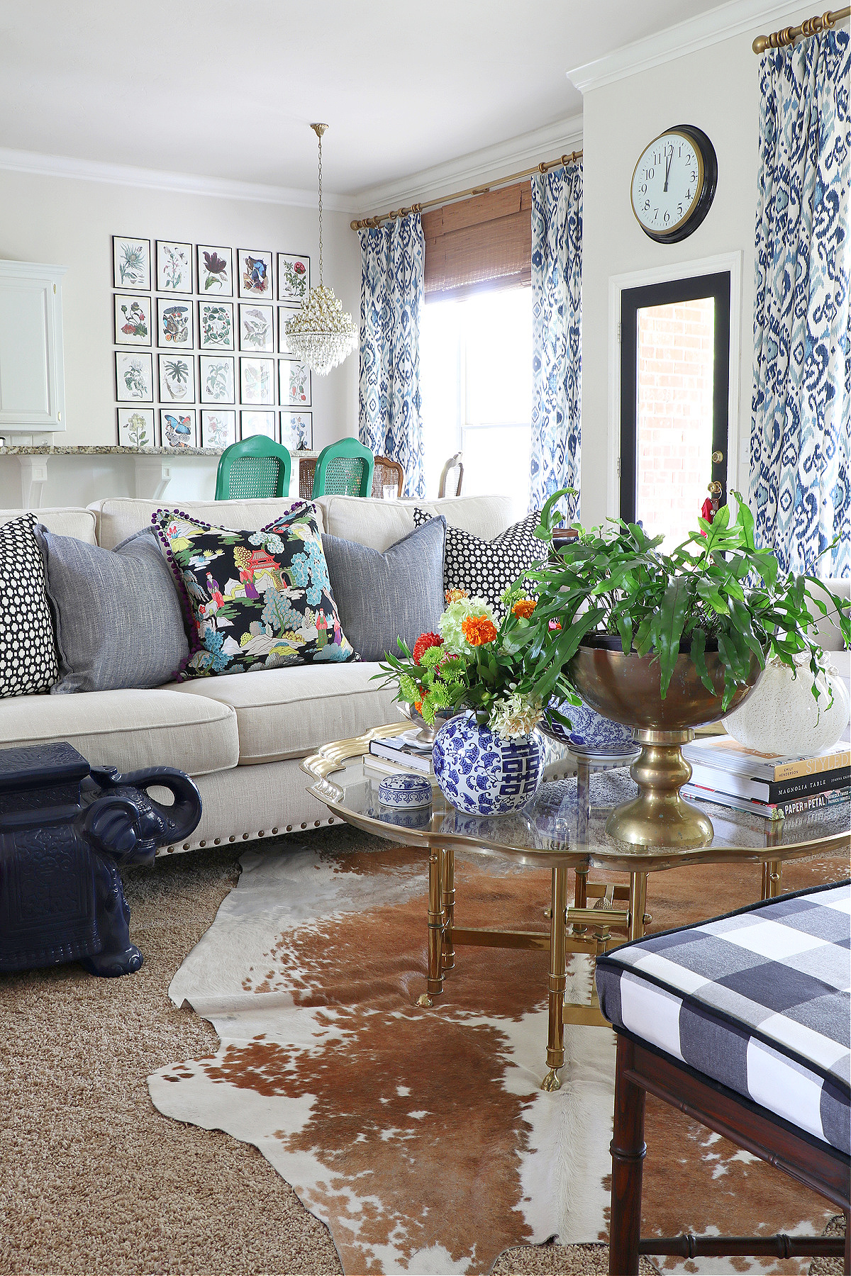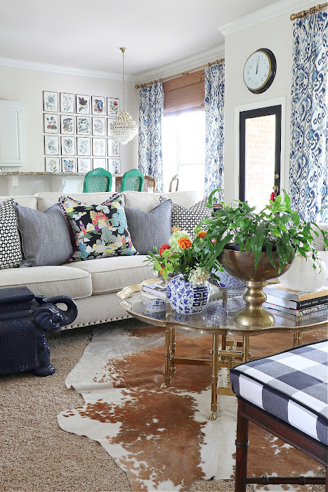 Blue and White Curtain Fabric || Black and White Pillows || Similar Blue Pillows || Colorful Toile Pillows Information || Elephant Stool- Ross, painted Rustoleum Gloss Navy || Cowhide Rug || Buffalo Check Fabric || Brass Coffee Table- Vintage || Sofa and Loveseat