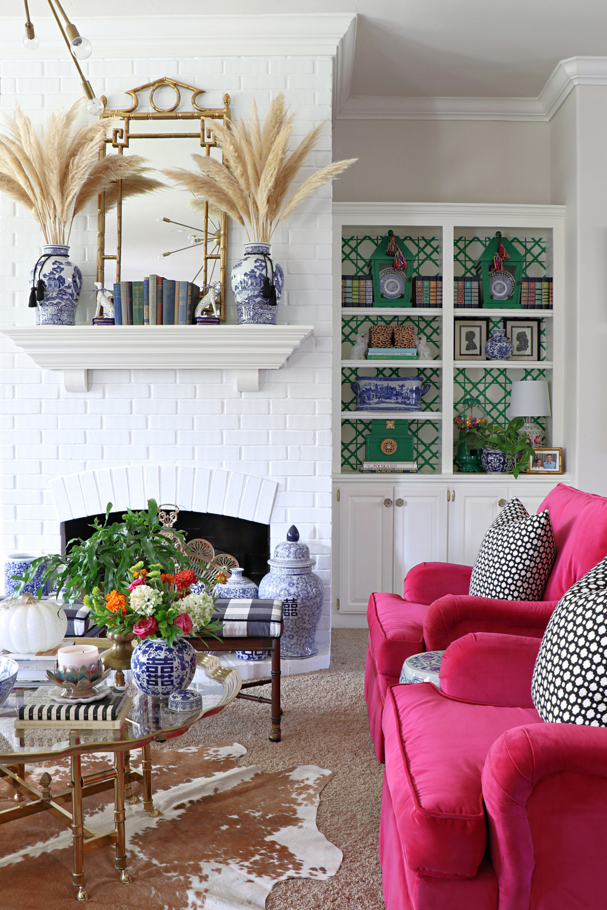 Pampas Grass Stems || Black Tassel Ties || Brass Fireplace Screen || Pagoda Mirror || Buffalo Check Fabric