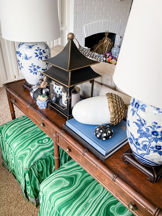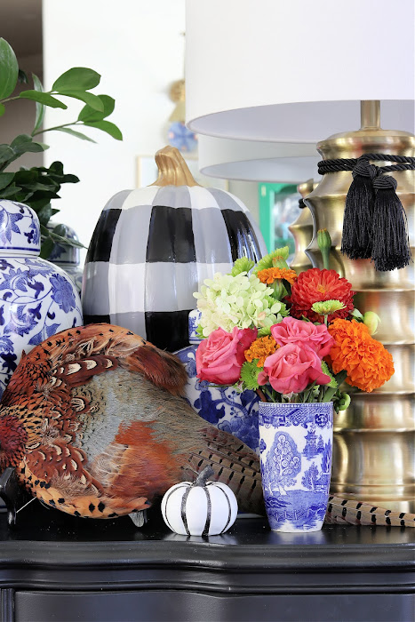 Let's begin the tour just inside the front door. This year i wanted to do a primarily blue and white and black and white color scheme with some natural colors and textures mixed in. That will be a little more evident when I share my Fall Patio with you since I could limit the colors a bit more outside, but inside the house there can't help but be some other colors mixed in as well. And of course I'm ok with that!